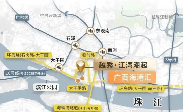 轨道交通方面,项目坐拥三地铁环绕的稀缺优势,彻底打通全城出行脉络。在建的地铁 10 号线大干围站,与项目直线距离仅约 650 米,据官方规划,该线路预计 2026 年底正式通车,通车后可直达天河体育西、中大等城市核心商圈,无缝衔接天河、海珠、越秀等主城区,大幅缩短跨区通勤时间,无论是上班通勤、逛街购物,还是就医求学,都能快速抵达。除此之外,项目周边还环绕地铁 2 号线南洲站、广佛线石溪站,步行距离均在 1 公里左右,2 号线可直达广州火车站、公园前、嘉禾望岗等重要枢纽,广佛线则实现广州与佛山的跨城联通,满足不同方向、不同场景的出行需求,真正实现轨道交通全覆盖,让业主轻松畅达全城。