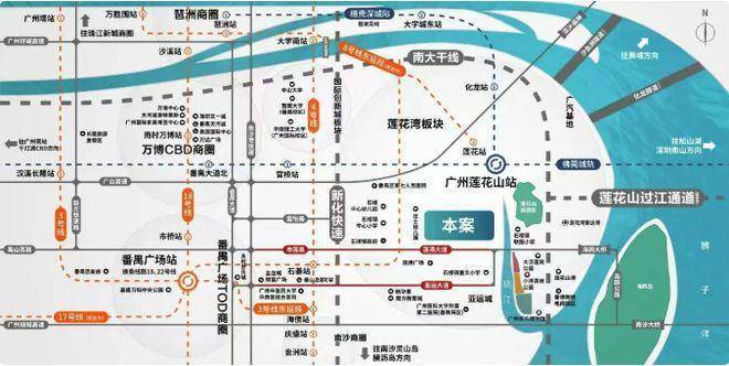 交通优势得天独厚,南大干线预计 2023 年全线贯通,双向 6 - 8 车道且不设红绿灯,限速 80km/h,并接驳新化快速,可快速畅达广州主城区,10 分钟抵达国际创新城、15 分钟直达万博 CBD 商圈、25 分钟到达广州南站商业区。距离项目 10 分钟车程的莲花山站,交通网络发达,8 号线东延段(规划中,7 站可达万胜围)、17 号线(规划中,5 站可达番禺广场)、佛莞城轨(预计 2022 年年底通车,2 站到万博,3 站到广州南站)、穗莞深琶洲支线(在建,3 站到琶洲)在此交汇。此外,莲花山过江通道(预计 2027 年完工)、化龙隧道(预计 2022 年底动工)、沙鱼洲隧道(规划中且已动工)等三隧道建成后,10 分钟可到达黄埔,加强与周边区域的联系,极大提升了项目的区位价值。