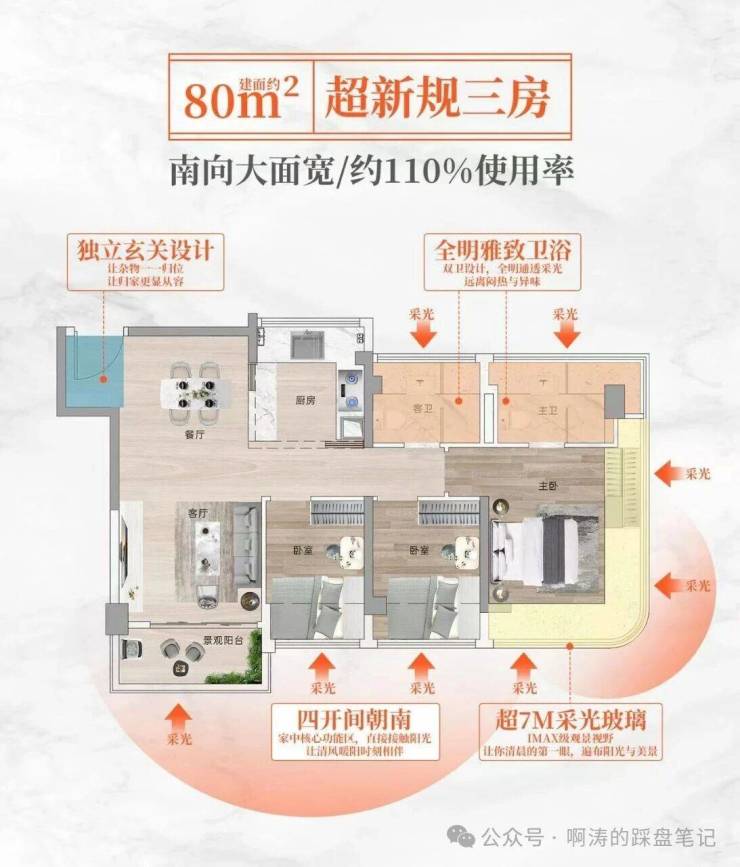 答:项目打造建面约80-125㎡全南向三至五房户型,依托最新住宅设计新规,实现了超100%的超高使用率,最高可达约110%,80㎡即可打造全能三房两卫,93㎡可做舒适四房两卫,空间实用性远超市场同面积段产品。全系户型采用全南向布局,最高实现五开间朝南,搭配270°弧形玻璃幕窗、大面宽观景阳台、LDK一体化灵动设计,空间零浪费,功能布局科学,完美适配从首置到改善的全周期居住需求。