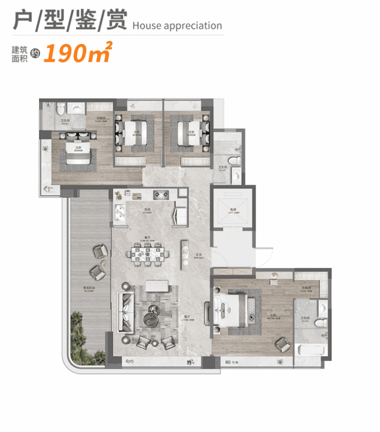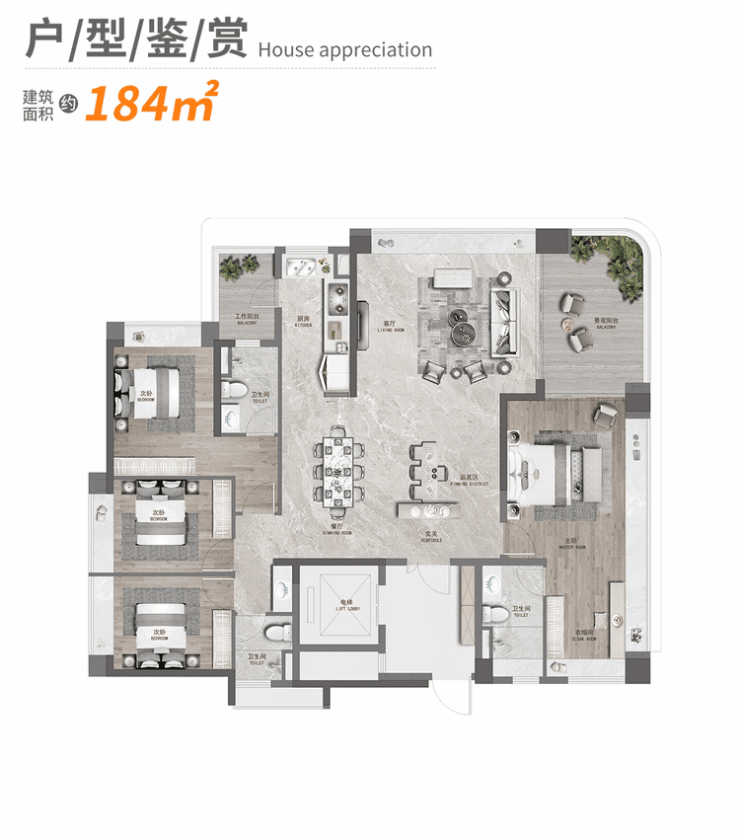 160㎡四房:270°观景端厅,约8米面宽阳台,主卧带独立衣帽间及卫浴。