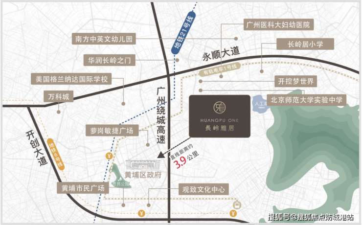 知识城长岭雅居位于黄埔区长岭居板块,地处广州东部山水新城生态宜居示范区,距黄埔区府直线距离仅3.9公里,是科学城CBD的“后花园”。项目周边交通、教育、医疗、商业配套全面升级,实测数据如下: