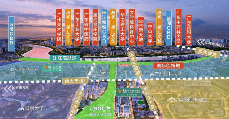 交通网络的完善是区域价值提升的重要支撑。除了前文提到的地铁 4 号线和新开通的南大干线外,金光东隧道的即将通车更是为区域交通注入了新的活力。这条隧道将直接连接大学城一期与外部路网,大幅缩短通行时间,提升区域对外联系的效率。此外,随着广州南站、白云机场等重大交通枢纽的辐射效应增强,广州国际创新城的区位优势将进一步凸显。它不仅服务于本地居民,更将成为连接粤港澳大湾区乃至全国的重要节点。