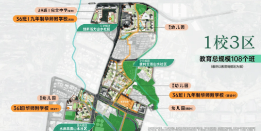A2:项目规划打造8所学校,涵盖4所幼儿园、1所小学、2所九年制学校、1所完全中学,已正式签约引入九年制“华师附”教育体系,教育资源优质且确定。