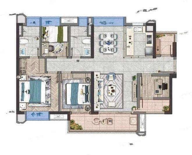 115 平四房户型:此户型适合人口较多的家庭。四个房间的设置,可满足家庭成员不同的生活需求,无论是作为卧室、书房还是儿童房,都能轻松安排。客厅连接景观阳台,让整个空间通透明亮。而且四房户型的布局更显方正,空间利用率高,充分展现了舒适与实用的完美结合。