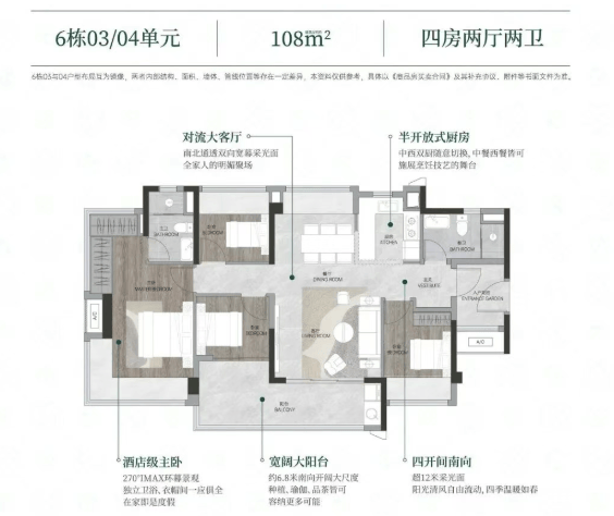 其中,88-89㎡三房配备约6.2米大阳台、LDK一体化客餐厅、四开间朝南,功能齐全;106㎡四房拥有超12米采光面、酒店级主卧套房;108㎡则配置约6.8米河景阳台、南北对流客厅及270°IMAX环幕视野,部分高层单位可望江景。所有户型均设有入户花园与超大飘窗,进一步拓展使用空间,满足多孩家庭、三代同堂等多样化生活场景。