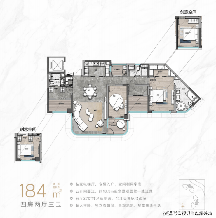 253㎡环幕江景大平层:270°俯瞰江景,匹配塔尖人群圈层需求,全屋采用大金中央空调、汉斯格雅卫浴、博世厨电等国际一线品牌,交付标准达5000元/㎡。