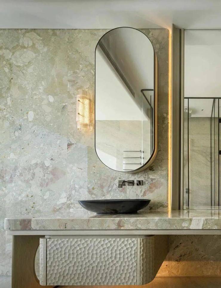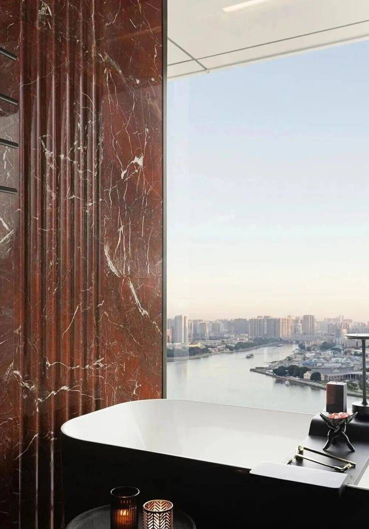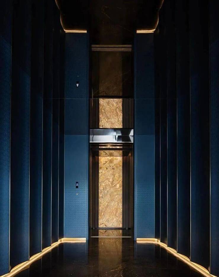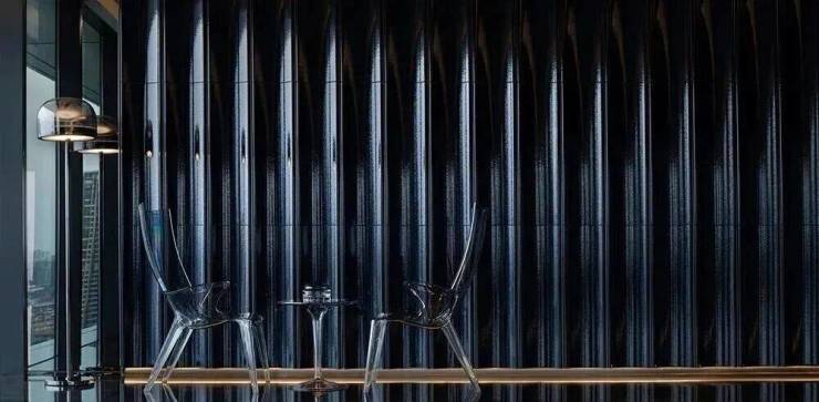 项目以“天际悦享荟”为核心社交空间,位于顶层,拥有270度全景视野,尽揽珠江壮阔与城市繁华。设计团队将“三江汇聚”的意象融入空间叙事,以超薄透光天然石与定制水波状木饰面,营造静谧光影与流动水韵的对话。胡桃木饰面搭配宝格丽黑石点缀,脚下卡慕白石纹理呼应岭南山水,红色长凳成为视觉焦点,赋予归家仪式感。蓝色陶瓷波浪墙、黑色镜面不锈钢天花与宝格丽黑石地面形成现代诗意的水韵意境,鎏金光晕延伸展开,彰显轩昂气度。