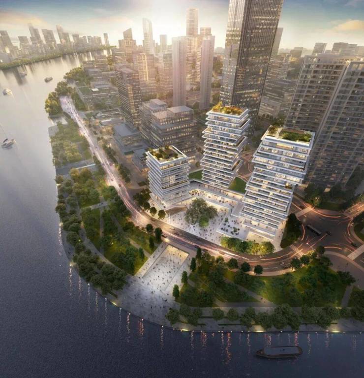 鹅潭一号由全球知名建筑事务所DCM合伙人龚耕操刀设计,以“45°旋转塔楼”为核心概念,通过错台式布局与楼板错位设计,赋予建筑动态的流动感。三栋塔楼呈怀抱式布局,既消解了楼宇对视的局促感,又实现了270°无遮挡江景视野。外立面采用单元式铝合金构件与大面积玻璃幕墙,金属的沉稳与玻璃的通透形成强烈对比,光影在建筑表面流转,宛如珠江畔的灵动雕塑。