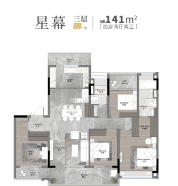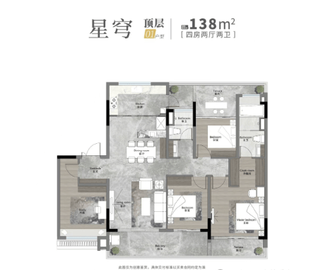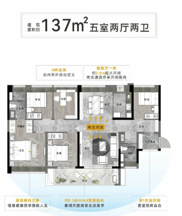项目主力户型为建面约98㎡至137㎡的三至五房高层产品,空间布局方正,功能分区合理。其中,顶层“星穹”户型配备天台大露台,适合社交与观景;中间层“星幕”户型强调收纳与瞰景体验,设独立玄关与双卫干湿分离。此外,项目独创建面约140㎡花园小洋楼,采用一轴三横邻里花园布局,兼具大平层尺度与低密花园环境,满足高端改善客群对私密性与舒适度的双重追求。