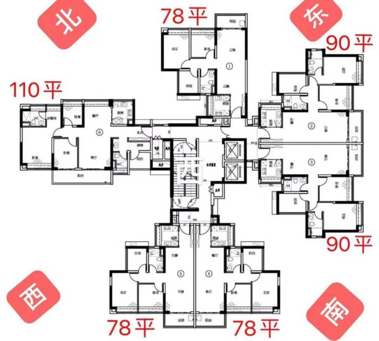 项目户型涵盖78平三房、90平三房以及110平四房三个户型。