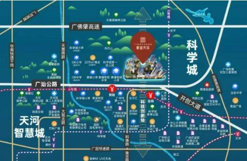 振业天成位于黄埔科学城核心区,与智慧城一路之隔,区位优势明显。社区步行约1.4公里可达地铁6号线黄陂站及金峰站,实现与天河智慧城及珠江新城等中心城区的高效衔接。除轨道交通外,社区依托广汕路、广园快速、广佛肇高速等“五横三纵”立体路网,覆盖科学城企业总部、CBD商务区及主要生活圈。正常自驾条件下,自社区出发约20公里可达珠江新城,约17公里至琶洲,交通便捷,满足家庭日常出行及城市通勤需求。