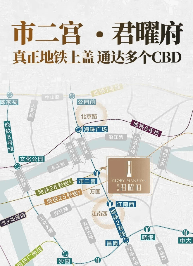 君曜府落子海珠市二宫板块,地处广州千年中轴线南延起点,北望越秀老城,南接江南西商圈,东临珠江主航道,西靠海珠桥头。这里是十三行时期中外贸易繁盛之地,也是广府文化与商业传统的发源地之一。