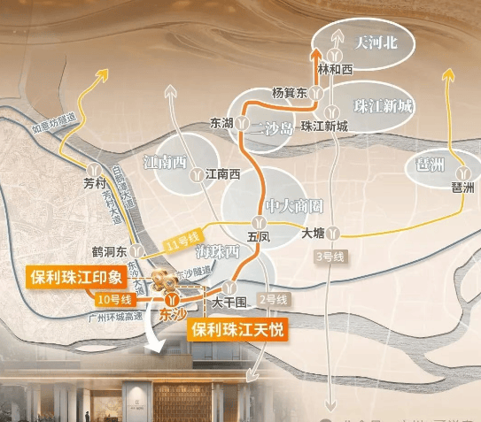 项目地处荔湾区东沙板块核心,交通优势显著。地铁方面,距离 10 号线东沙站仅 700 米(步行 8 分钟),4 站直达中大,6 站到滨江东,零换乘 30 分钟抵达珠江新城,未来还可接驳 11 号线(环线)、22 号线,快速串联广州核心商圈与佛山;规划中的水上巴士及港湾码头(3 年内完工),将进一步丰富出行方式,实现 “江铁联运” 的滨水生活体验。自驾出行便捷,邻近东沙大道、东新高速、环城高速,5 分钟通过东沙石岗隧道连接海珠西,10 分钟可达白鹅潭万象城、双太古商业等高端配套,路网发达保障日常通勤效率。
