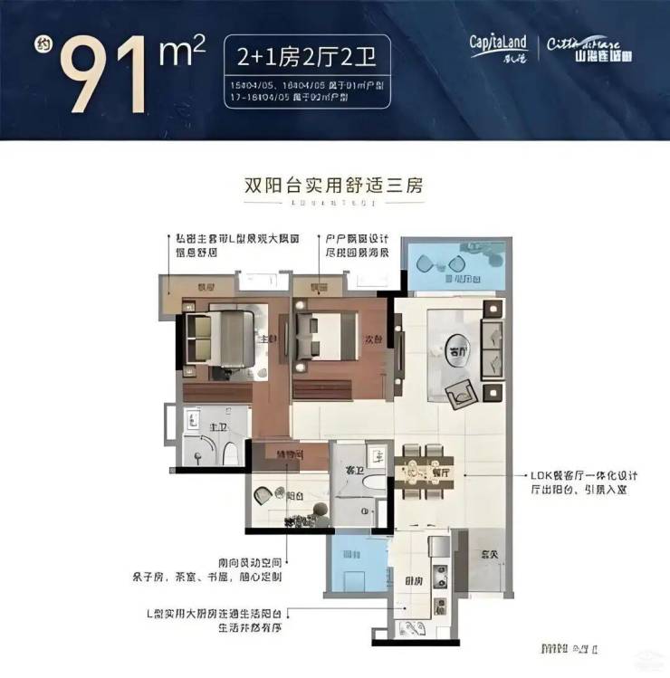 91㎡/106㎡三房两厅两卫:功能分区合理,动静分离,适合改善型家庭,兼顾舒适与性价比。