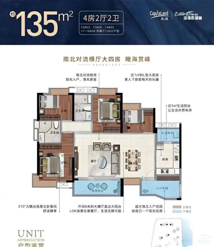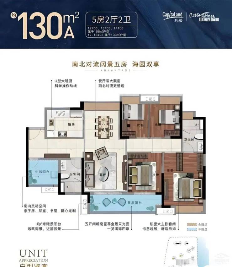 130㎡/135㎡四房/五房两厅两卫:奢华大平层设计,南北通透,采光极佳,适合追求高品质生活的大家庭。