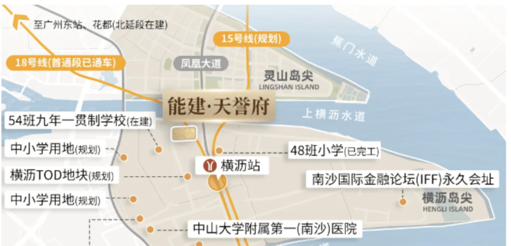 天誉府坐落于南沙横沥岛横沥大道东南二桥东地块,距离江面直线约150米,稀缺江景资源触手可及。项目紧邻横沥站,三条地铁线路(15号线、18号线、32号线)交汇,18号线已开通,15号线和32号线处于规划或建设阶段。交通网络完善,周边连接广澳高速、南沙港快速路,快速通达广州、东莞、佛山及中山等城市。优越的地理位置和交通条件,使得天誉府不仅满足居住需求,也具备显著的城市资源整合价值。