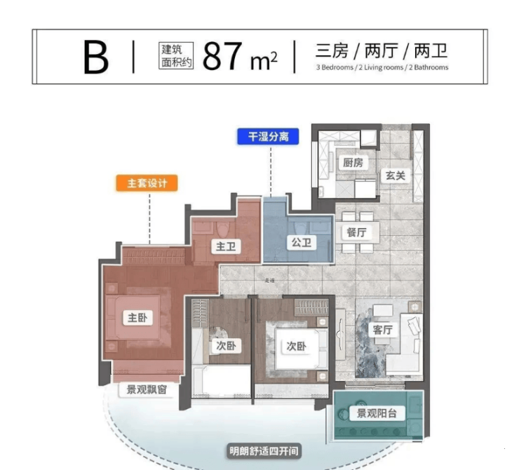 高得房率设计:项目主力户型的得房率处于行业领先水平。例如,76㎡的三房户型,通过合理的动线设计和空间利用,实现了功能分区明确、无浪费空间的效果;128㎡的四房大户型,更是通过赠送飘窗、阳台等方式,进一步拓展了实际使用面积。