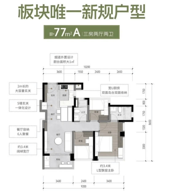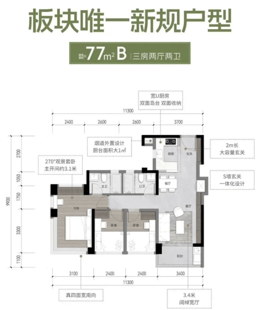 年轻家庭可选择77㎡三房两卫户型,在有限预算内兼顾功能与学区,轻松实现“一步到位”;