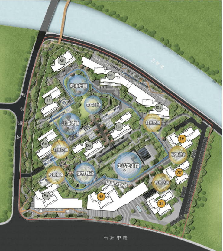 项目周边社区生活环境成熟,居住氛围浓厚,周边以成熟住宅小区、公办学校、生态公园为主,无大型工业、噪音污染源,居住静谧度高。自然景观方面,内河碧道、外河公园环绕,日常可沿河岸散步、休闲,享受滨水生态景观;大象岗森林公园、长隆旅游度假区近在咫尺,周末可轻松开启亲子游玩、生态康养之旅。