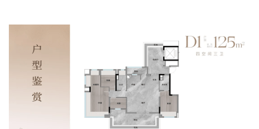 125㎡四房两厅三卫:板式洋房,专梯入户,4 房 3 卫双主套设计,南向 13 米采光面,8 米宽景阳台,主卧带独立梳妆区与卫浴,改善家庭一步到位首选,低密居住体验对标高端项目。