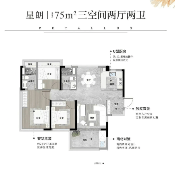 以热销的75㎡三房两卫为例,不仅实现南北对流、独立玄关,更以88㎡的实际使用面积,媲美市面上110㎡的二手住宅。三口之家甚至加上一位长辈,都能拥有各自独立的私密空间,彻底告别“凑合住”的窘境。