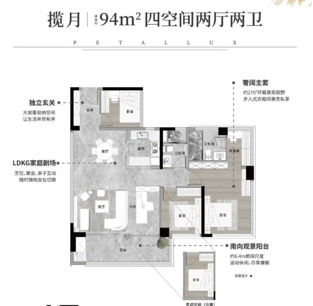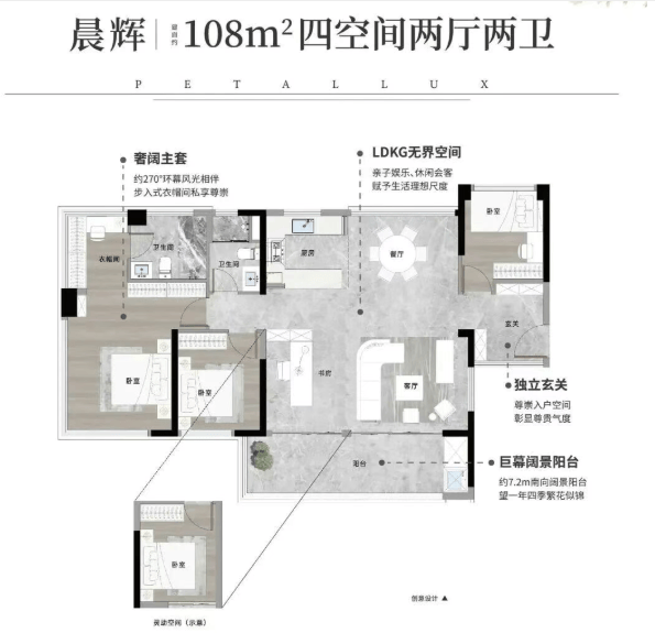 108㎡四房:总价约270万起,空间灵活可变,满足二胎、养老等多元需求,是刚改家庭的理想之选。