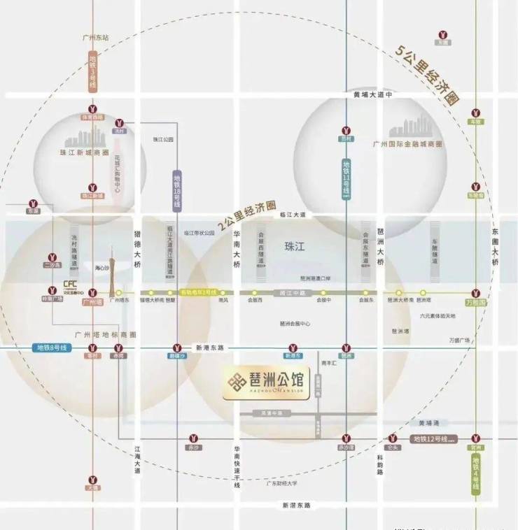 项目距离地铁8号线新港东站步行约600米,从B口出来穿过南丰汇广场就能到。早高峰打车去珠江新城CBD大概20分钟,如果坐18号线(快线),3站到冼村也不到10分钟。周边还有4条在建或规划中的地铁线,未来通勤选择会更灵活。开车的话,华南快速和新光快速入口都在3公里内,去机场或南沙也相对顺路。