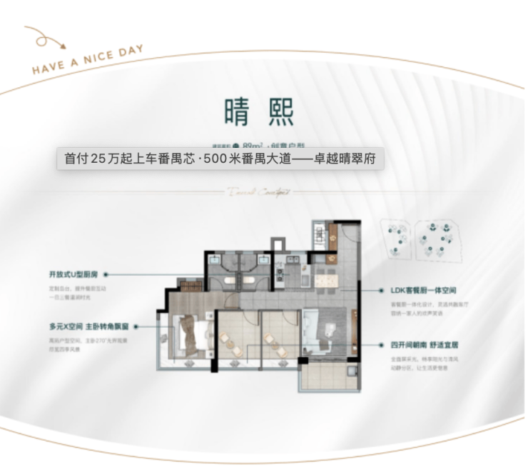 卓越晴翠府户型设计兼顾美学与功能性 以舒适实用的空间布局满足家庭多样化居住需求 建面约89至130平方米 三房至四房产品灵动布局 全屋南向采光 宽景阳台设计 打造更通透的生活空间 采用LDKB一体化理念 将客厅 餐厅 厨房 阳台连贯成景 拓宽空间感 主卧配备270度转角飘窗与独立衣帽空间 拥有星级套房般居住体验 开发商在细节中注重生活动线规划 将实用率提升至超百分百 同时项目整体容积率仅2.8 社区低密宜居 户型选择多样 可满足首次置业与改善型客户不同需求 在户型研发上 卓越团队结合广州人居习惯 打造出既注重私密性又兼顾家庭互动的理想空间 实用与美学兼具