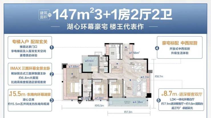 💡湖心环幕大四房,建面约147㎡四房两厅两卫