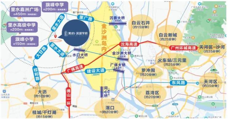 【临广核芯|金沙洲最值得购买的地段】直线距离约3km至白云,1有轨电车(建设中)2地铁(规划中),建成后1站白云,4站荔湾,7站越秀,直通天河;门前里水大道,一桥连接白云、荔湾,速达广州多区。