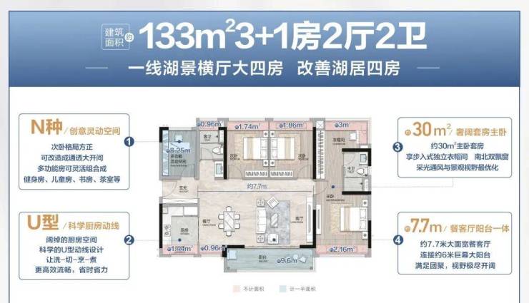 💡湖心环幕大四房,建面约145㎡四房两厅两卫
