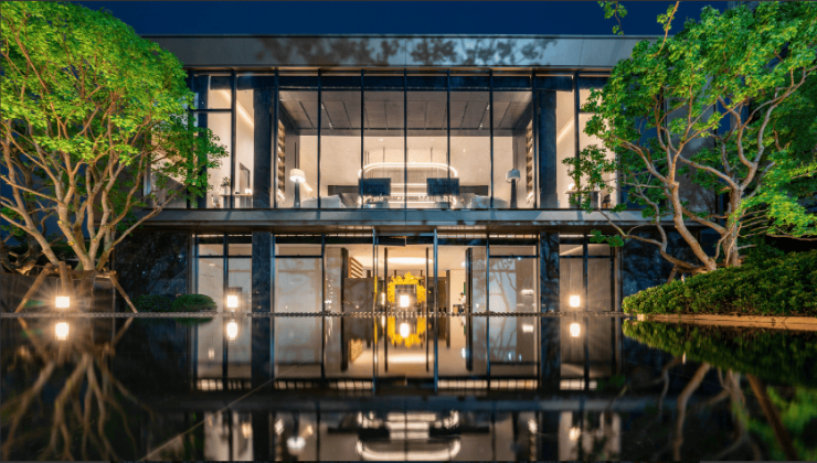 社区内部配套以“安缦系”园林为理念,打造约5200平方米围合式五进景观,体量相当于12个标准篮球场。一进为宽约50米的奢雅府门,结合金属与石材营造尊贵感;二进前园设水境跌水与“濯缨水阁”廊架,两侧种植乌桕林;三进水庭包含约400平方米酒店式泳池CLUB,配有廊架吧台与休闲躺椅;四进林苑设立0至14岁儿童游乐区,作为亲子研学基地;五进宅院则通过双重格调入户大堂完成归家仪式。此外,项目还规划了8大泛会所,包括行政酒廊、健身能量场、友邻会客厅、创识学堂、轰趴馆等功能空间,其中健身区域已引入“无鸭力健身”品牌,采用全景玻璃幕墙设计,提前兑现部分生活场景。