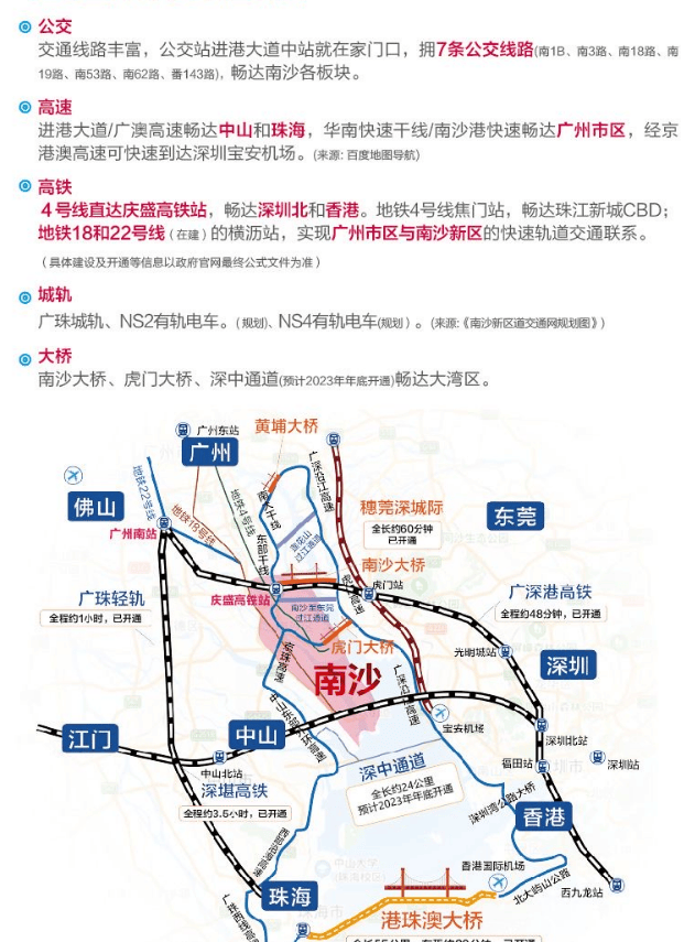 自驾——已开通的南沙港快速、广澳高速、南二环高速、连通南沙大道、虎门大桥,畅通广州、东莞、中山;深中大道、南中高速无缝连接中山、深圳、珠海、澳门等地;南沙大桥实现30分钟到深圳宝安机场、前海地区;