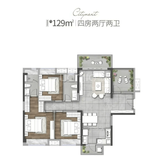 129㎡四房两厅两卫户型,主打刚改与改善需求,总价约206万起,适合三口之家、四口之家居住,既能满足居住需求,也能预留出足够的空间用于休闲、办公。该户型最大的亮点的是7.2米巨幕阳台,视野开阔,可俯瞰社区中央园林美景,无论是观景、休闲,还是晾晒,都能满足需求。采用LDK一体化布局,客厅、餐厅、厨房相互连通,提升了空间的通透感与利用率,家人做饭、用餐、休闲时,可随时互动,增进家庭感情。四个房间布局合理,空间宽敞,主卧带独立卫生间与飘窗,舒适度与私密性兼具;其余三个房间可根据家庭需求,打造为儿童房、书房、客房等,适配家庭的不同阶段需求。户型整体采光充足、通风流畅,动静分区清晰,让居住更舒适、更便捷。