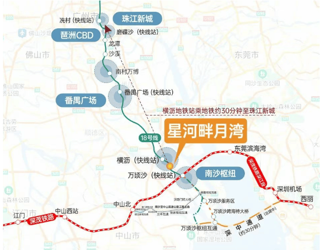 星河·畔月湾交通优势明显,首批交楼后将开通免费业主楼巴,接驳地铁18号线横沥站,地铁18号线贯穿南北,快速连接广州核心区域。此外,距离南沙枢纽站仅约5公里,未来深江高铁(在建中)将接入,实现2站到深圳机场的便捷出行。灵新大道作为南沙凤凰大道后的第二条主轴,正在进行超42亿的改扩建工程,将进一步提升区域交通通达性。