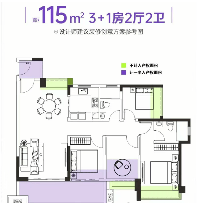 115㎡四房两厅两卫:宽敞舒适,拥有独立书房,满足大家庭的需求。