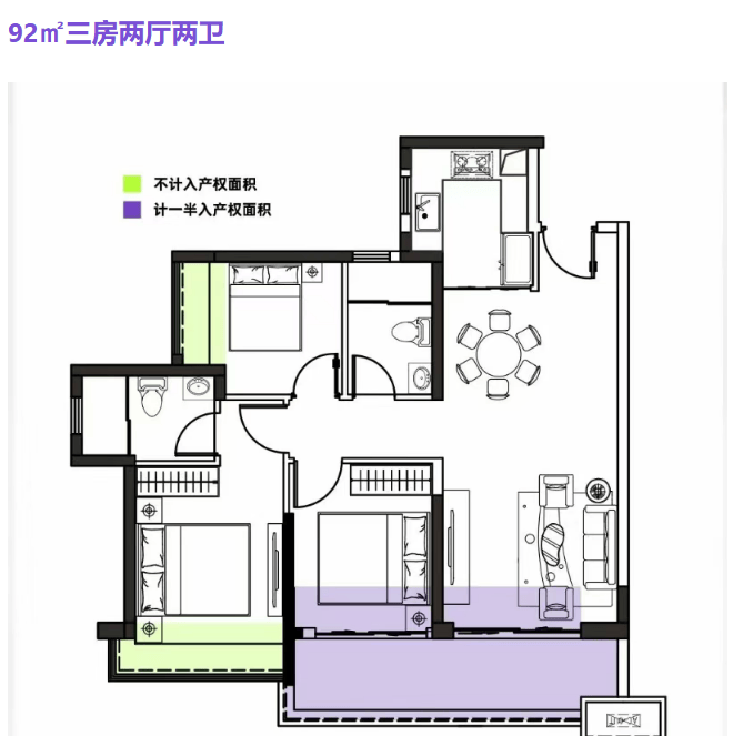 92㎡三房两厅两卫:紧凑实用,功能分区明确,适合年轻夫妇或小型家庭;