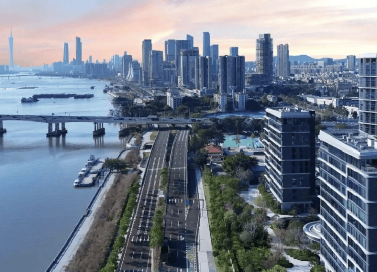 项目通过创新的蝶形点式平面布局,将楼栋巧妙旋转角度,并大幅增加南向立面,确保每一户的主要功能空间(客厅、主卧等)均朝向正南方的珠江。所谓“五面瞰江”,是指通过客厅、餐厅、主卧、次卧乃至厨房等多角度、大面积的玻璃幕墙,在家中不同位置都能欣赏江景,实现景观最大化。视野方面,项目南向直面珠江前航道最宽处,无任何遮挡,向西可远眺广州塔、珠江新城(直线距离约5公里),向东可望琶洲天际线,正面是浩瀚江景,构成一幅宽度超8公里的立体城市画卷,部分高楼层单位视野极为震撼。