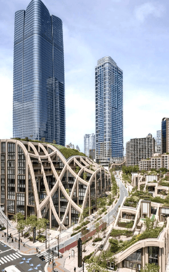 琶洲CBD的设计接轨全球先进城市规划理念,由孙一民教授主导,对琶洲CBD进行立体集约化的“精明设计”,构建符合时代发展需求的前瞻性城市超级底盘,实现人、自然、建筑的和谐共生。