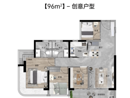 96平方米四房两厅两卫:西南向,使用率100%,配有约5.7米面宽瞰山阳台,主卧270°弧形玻璃幕窗。
