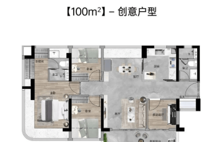 80平方米三房两厅两卫:东南向,使用率高达107%,四开间朝南,主卧配备270°弧形玻璃幕窗。