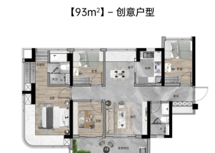 93平方米四房两厅两卫:东南向,使用率109%,独立入户玄关,南北通透,主卧同样采用270°弧形玻璃幕窗设计。