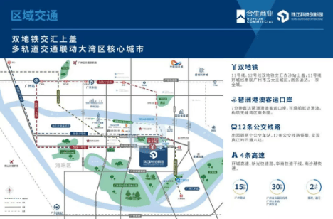 珠江科技创新园地理位置优越,交通网络发达,园区与地铁11号线、12号线赤沙站无缝连接,使得出行变得高效便捷。园区距离广州南站、广州东站、白云国际机场均在30分钟车程内,且仅需7分钟即可抵达琶洲港澳客运码头,实现快速连接粤港澳大湾区主要城市。