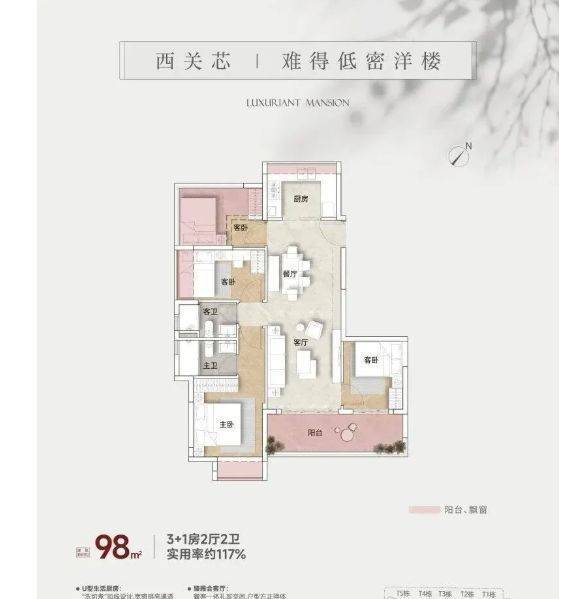 项目户型设计独具匠心,注重空间利用与居住体验,实现了超 117% 的高得房率。主力户型为建面约 98㎡、108㎡、156㎡的全南向板式住宅,均为四房设计。98 平户型可改造为 3 + 1 房 2 厅 2 卫格局,主卧自带大飘窗,客卧与主阳台直接连通,适合改善家庭一步到位。约 108 平四房户型,四开间朝南,三间卧室均为南向,主卧套房独占东南侧单边位,通风采光极佳。最稀缺的约 156 平四房户型,可扩展成 4 + 1 房 2 厅 3 卫格局,实现传统大平层才有的双套房设计,南北双阳台设计,通透性更好,拓展功能房后可满足三胎家庭需求。纯板式设计结合全东南向布局,确保户户通风采光俱佳,阳台、飘窗的极致创新设计,以及全屋科学布局的多功能飘窗(宽度约 80 - 100cm),大幅提升空间实用性与趣味性。