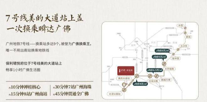 交通:作为佛山唯一纯地铁上盖豪宅项目,地铁 7 号线美的大道站就在家门口。地铁盘不少,豪宅盘也常见,但地铁上盖的豪宅项目却极为稀缺。便捷的轨道交通,无论是前往佛山其他区域,还是去往广州等周边城市,都极为便利,大大缩短了出行时间,提升了生活效率。