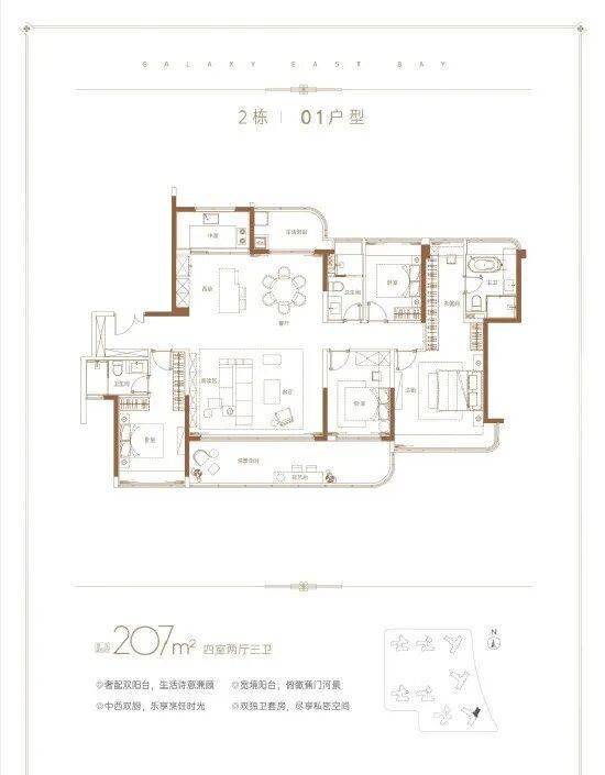 星河东悦湾推出的户型多样,包括从紧凑实用的101平方米三房到宽敞豪华的207平方米四房两厅三卫不等,满足不同家庭的需求。特别是部分户型设计中增加了额外的功能间,如书房或储藏室,提升了居住空间的灵活性和实用性。