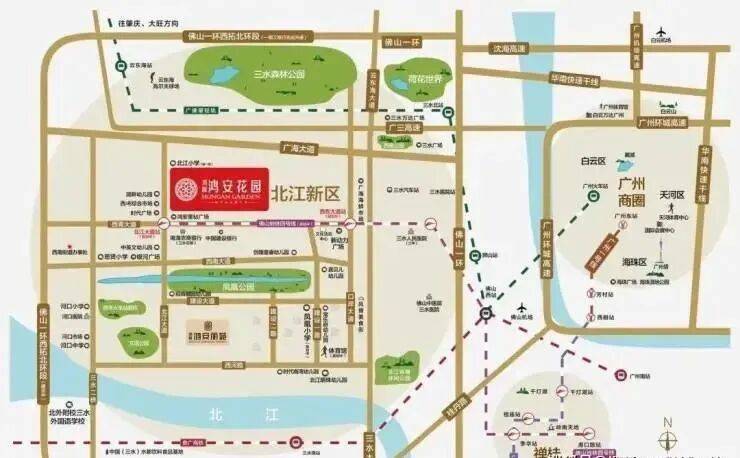 鸿安花园位于佛山市三水区北江新区,地理位置优势明显。项目紧邻广佛肇城际铁路云东海站、贵广/南广高铁三水南站,同时距离在建的佛山地铁4号线北江大道站较近,未来将形成“双高铁+一地铁”的轨道交通格局。日常通勤或跨城出行都更加高效。