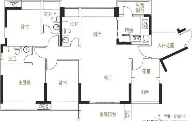 128㎡ 4房:四房两厅两卫三阳台,满足多孩家庭或三代同堂的居住需求,功能分区清晰,动静分离。
