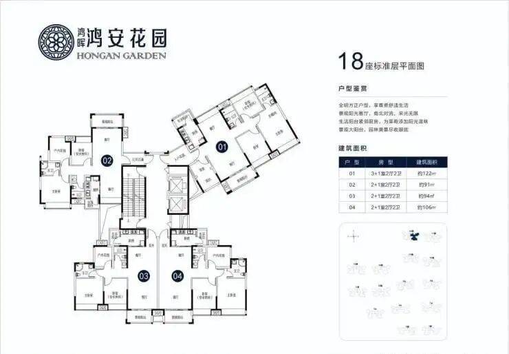 鸿安花园提供多种户型选择,主力面积段为约94㎡、106㎡和128㎡,均为三至四房设计,兼顾实用性与舒适度。