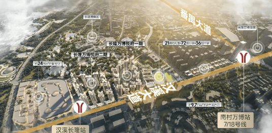 一期距汉溪长隆站约 500 米,二期下楼即地铁口。3 号线、7 号线、18 号线及广东城际在此交汇,距广州南站仅约 6 公里,出行超便捷🚇